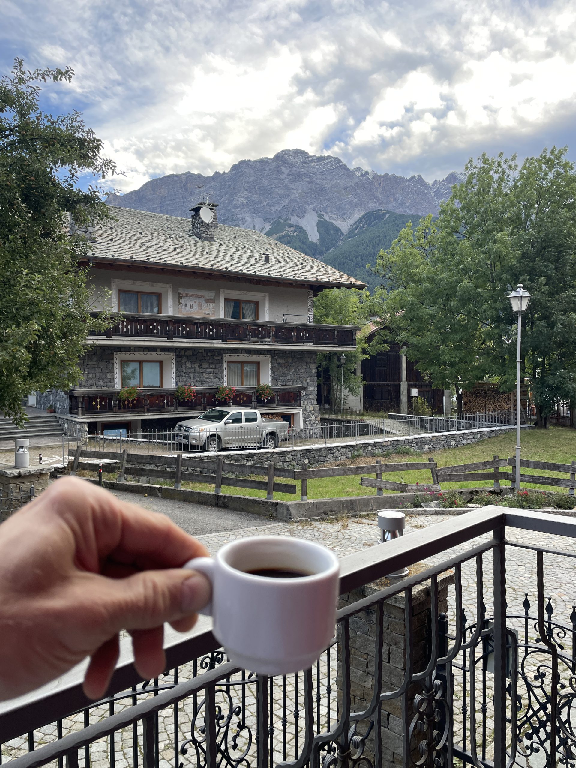 Podróż nie należała do najprzyjemniejszych, ciągle padało, wiał wiatr, drogi były na granicy zalania a zakładany czas wydłużył się prawie dwukrotnie. Udało nam się jednak dotrzeć a widok po wyjściu rano przed apartament bardzo skutecznie zatarł te złe wspomnienia z podróży. Alpy są majestatyczne, z takim widokiem mógłbym się budzić codziennie, a poranna kawa smakuje nader wybornie. Amen.