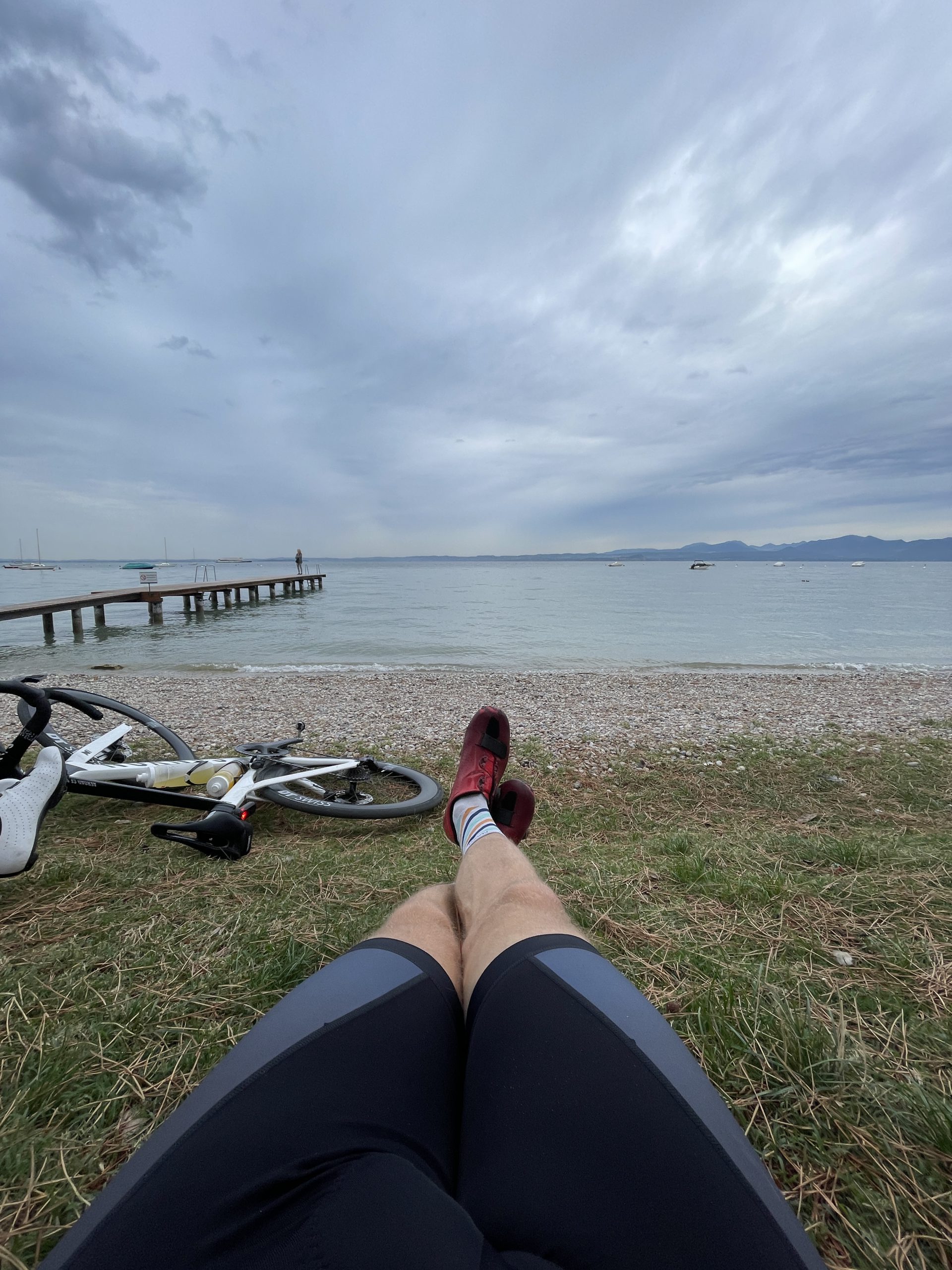 Objazd jeziora Garda. Coś na co czekaliśmy oglądając relacje w internecie. Trasa ok. 150 km i słynne balkony nad jeziorem. Początek trasy bardzo obiecujący, jednak szybko dzień ten przerodził się w rozczarowanie. Napotkaliśmy jakieś remonty i nie wiem czy przez nasze gapiostwo, czy przez fatalne oznaczenie wylądowaliśmy na drodze bardziej dla graweli czy MTB, niż dla szos. Co więcej jechaliśmy tak przez ok. 15 km., a jak już trafiliśmy w końcu na asfalt, okazało się że tą drogą będziemy się tylko oddalać od Gardy. Kupa nerwów, stracony czas i wielkie rozczarowanie. Zatrzymaliśmy się w pierwszej przydrożnej restauracji dopytać o drogę i okazało się, że chyba wielu, jak nie wszyscy ładowali się w taką kabałę jak my. Właściciel miał przygotowane zdjęcia oraz mapkę powrotu na trasę w czterech językach. Przypadek? Nie sądzę. Musieliśmy wrócić w sumie kawałek, ale najgorsze było to, że aby wrócić na drogę musieliśmy zejść 500 m kamienistą ścieżką ze sporym nachyleniem. W SPD i butach szosowych z rowerami na ramionach. Ja osobiście miałem takie „olewam to, wracam”. Nerwy i stracony czas (a dzień krótki) nie nastrajały do dalszej jazdy. Padła jednak decyzja, że ciśniemy – będzie fajnie. Czy było? I tak i nie. Z racji konieczności korzystania z drogi cały czas jechaliśmy w ruchu, pogoda lekko się zepsuła, nierzadko trasa daleko odchodziła od jeziora. Ale nie było wyboru z rowerami szosowymi, szutrami nie pojedziesz za długo. Z drugiej strony to była fajna, żwawa jazda, mijaliśmy sporo uroczych miasteczek i generalnie trasę można uznać za całkiem udaną. Poza tym Krzysiu na ostatnie 50 km wrzucił „tryb Pogacar” i wyszedł z tego fajny, widokowo śliczny, trening. Podsumowując – objazd Gardy trochę must be, ale czy z czystym sercem mogę polecić…?