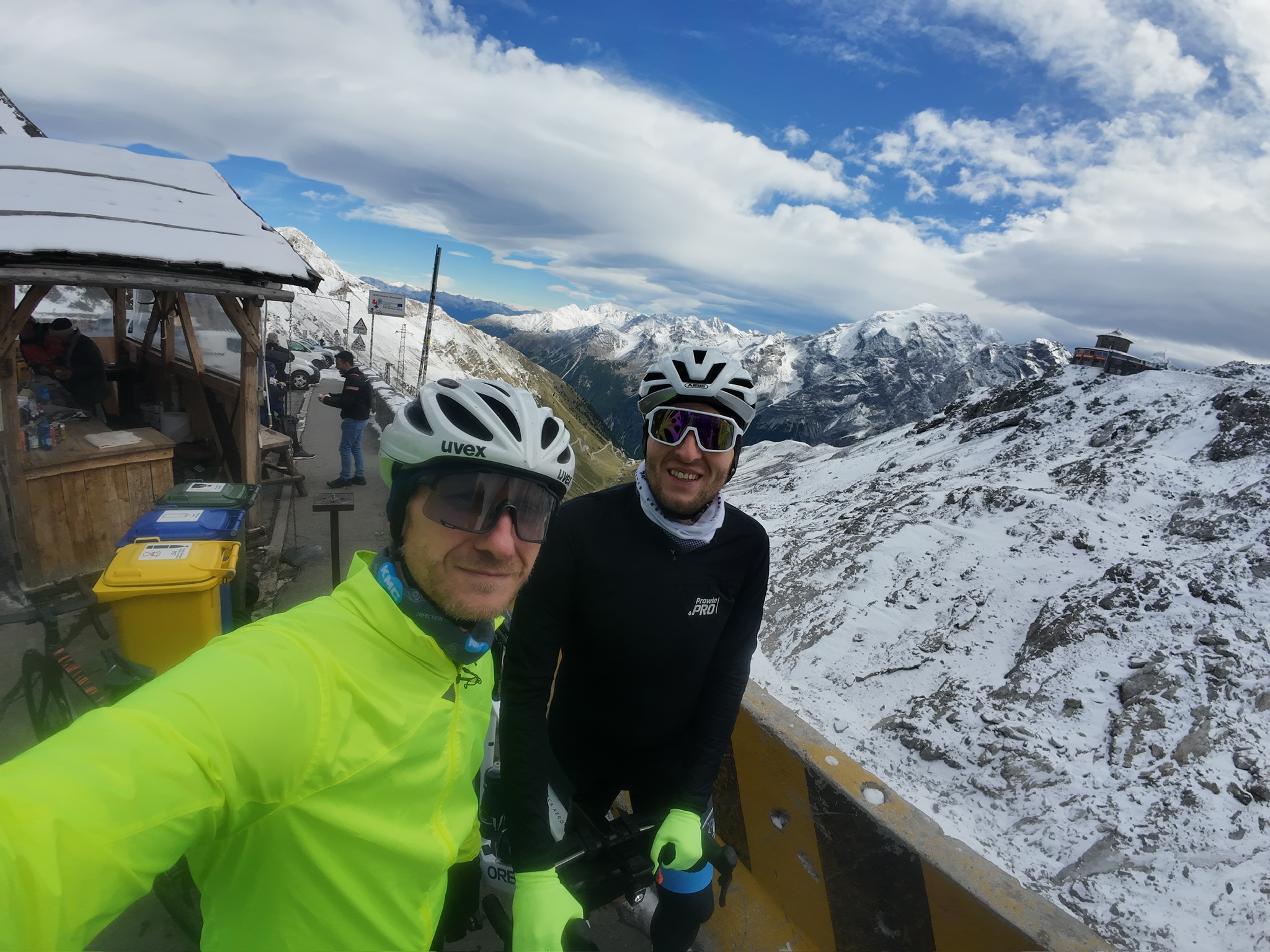 Odcinek między Santa Maria a Prato można określić mianem transferu. Fajna droga, ładne widoki, ale głowa już była przy wspinaczce od drugiej strony na Stelvio. Śmiało mogę powiedzieć, że tej ciekawszej strony. Ciekawszej kolarsko. Bo widokowo jednak od Bormio bardziej przypadło mi do gustu. Jednakże technicznie (plus narastające zmęczenie już przejechaną trasą) od Prato to było już wyzwanie wysokiej próby. Cóż, ciągle jesteśmy amatorami ze znikomym przygotowaniem, więc ostatnie kilometry, ostatnie zakręty to już byłą walka na całego z tą górą. A na szczycie? Szybka fotka i zjazd, bo jednak temperatura już bardzo, ale to bardzo zaczęła doskwierać. I tak proszę Państwa – Stelvio x2. W apartamencie prysznic i szybka, ale pyszna kolacja w lokalnej restauracji, bo jeszcze obowiązki regeneracyjne przed nami. No i trzeba było się wyspać przed dniem następnym, bo…